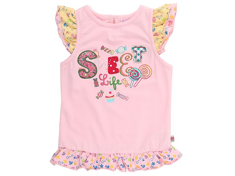 Футболка с рукавами крылышками, принтованной оборкой по низу и застежкой-капелькой сзади. Декорирована ярким принтом, аппликацией и стразами.