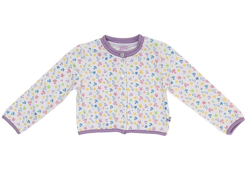 Жакет выполнен из мягкого трикотажа в принтованную ткань с летним рисунком. Спереди застегивается на пуговицы. Горловина, низ рукавов и изделия декорированы контрастным кантом.