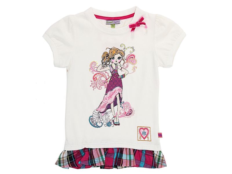 Футболка оригинального дизайна. Оборка внизу из контрастной ткани в клетку. Горловина украшена бархатным бантиком. Декорирована стильным принтом, вышивкой, стразами.