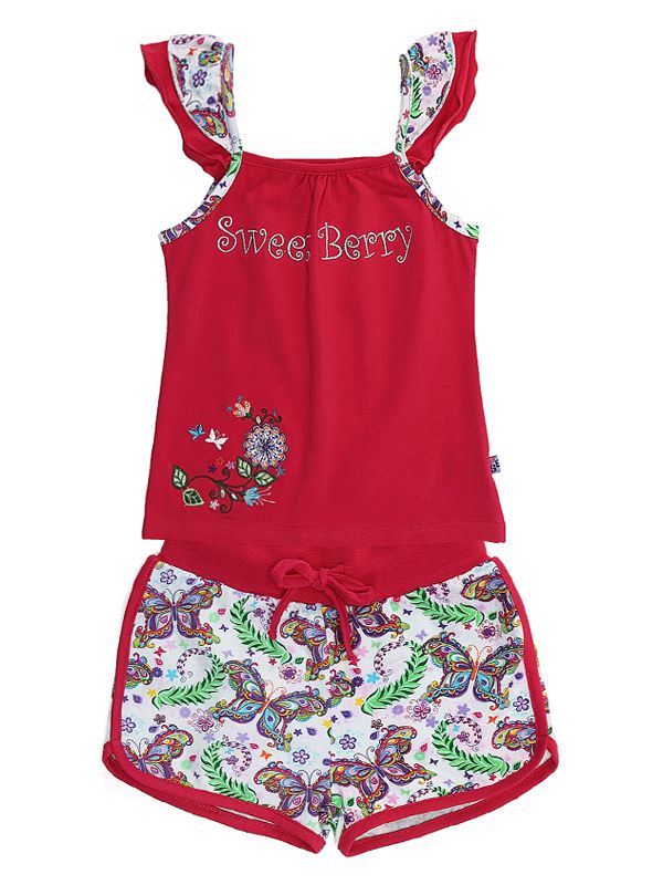 Яркий комплект из двух предметов: майка и шорты. Майка с бретелями-крылышками из двух видов ткани. Декорирована вышивкой. Шорты из принтованной ткани. Трикотажная резинка регулируется шнурком.