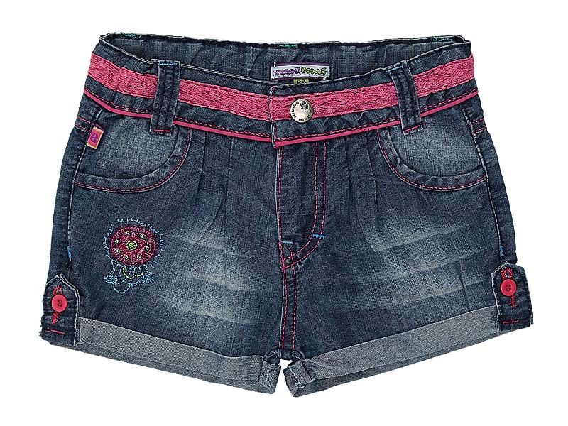 Джинсовые шорты с подворотом. Декорированы ажурной контрастной тесьмой. Украшены вышивкой. Пояс регулируется изнутри резинкой.