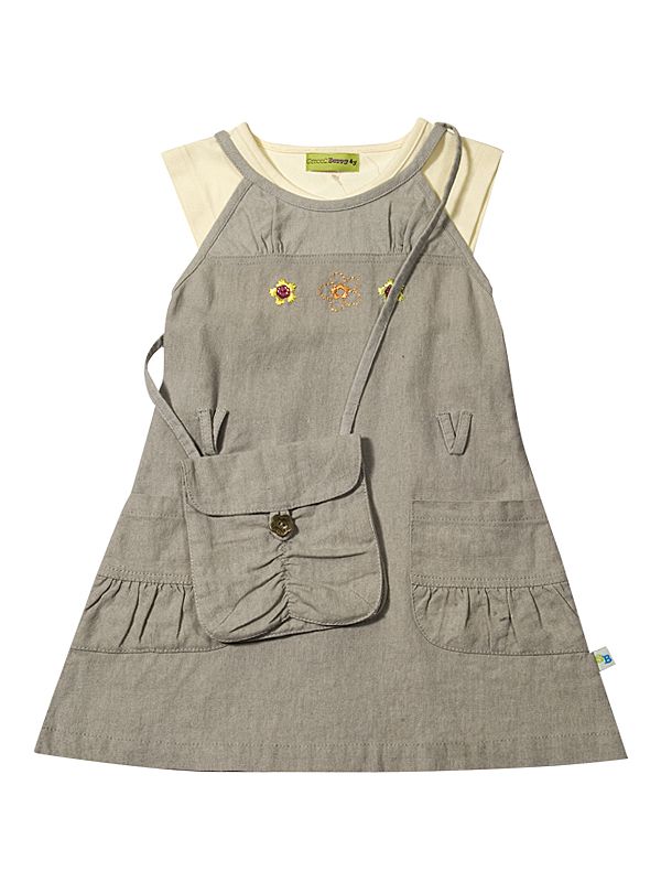 Платье состоящее из двух частей: кофты из мягкого трикотажа и сарафана из хлопчатобумажной ткани. Декорирован вышивкой, с дополнительной сумкой из хлопка